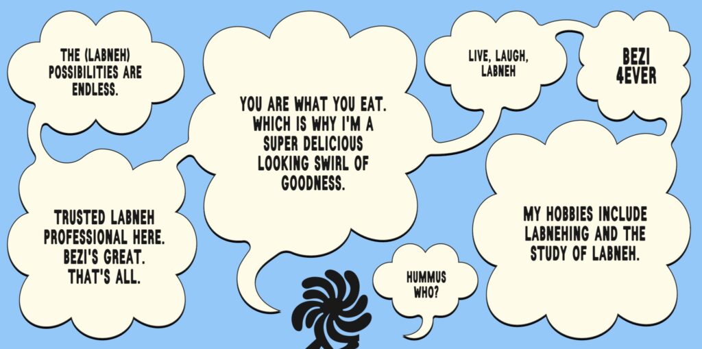 What is Bezi? It’s a new labneh dip. What is labneh? It’s a creamy yogurt cheese, popular in Middle Eastern cuisine. Now, admittedly ‘creamy yogurt cheese’ does not sound appetising, but just wait till you see the packaging.