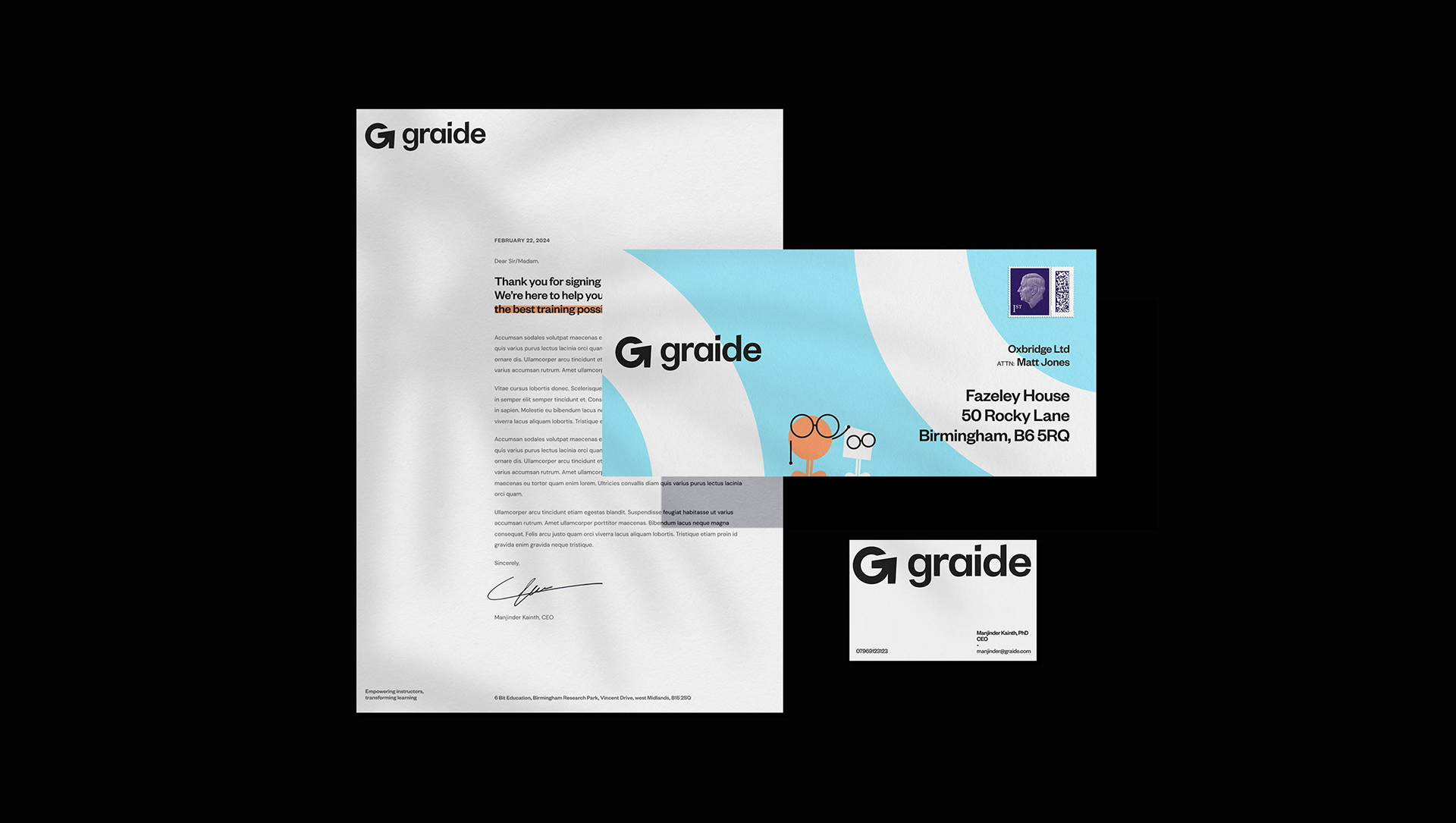 The use of mascots and illustrative effects such as the highlighter injected personality into the brand, making the world of AI feel warmer and more inviting whilst also clearly placing Graide within the education and training sectors.