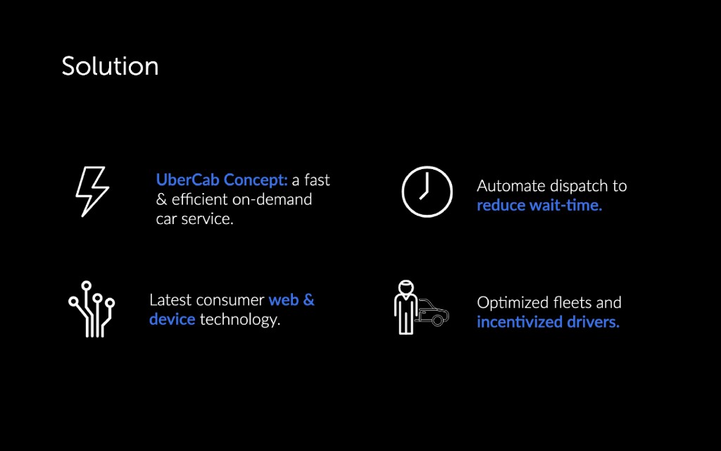 Uber‘s original pitch deck focussed on the (at the time) novel idea of allowing riders to use cabs that are driven by self-employed drivers.