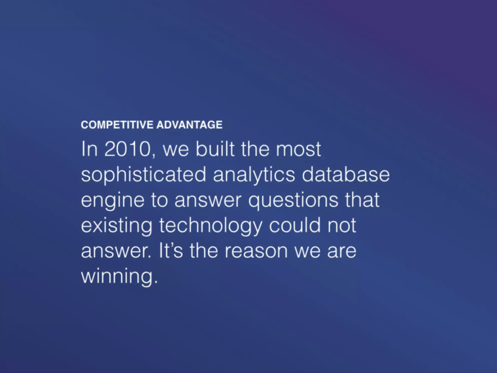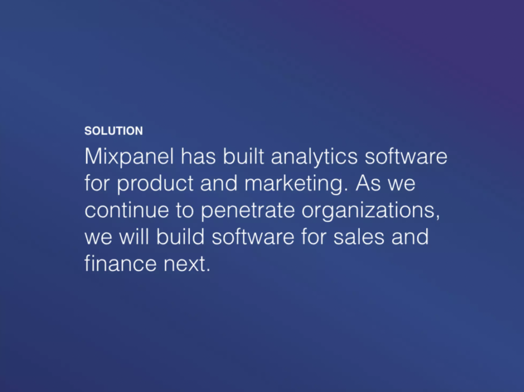 The Mixpanel pitch deck was highly simplistic with a focus on minimal text and bold copy. The problem and solution slides were both composed of short, snappy sentences, which allowed investors to easily understand what the company was trying to achieve, supported by its memorable presentation.